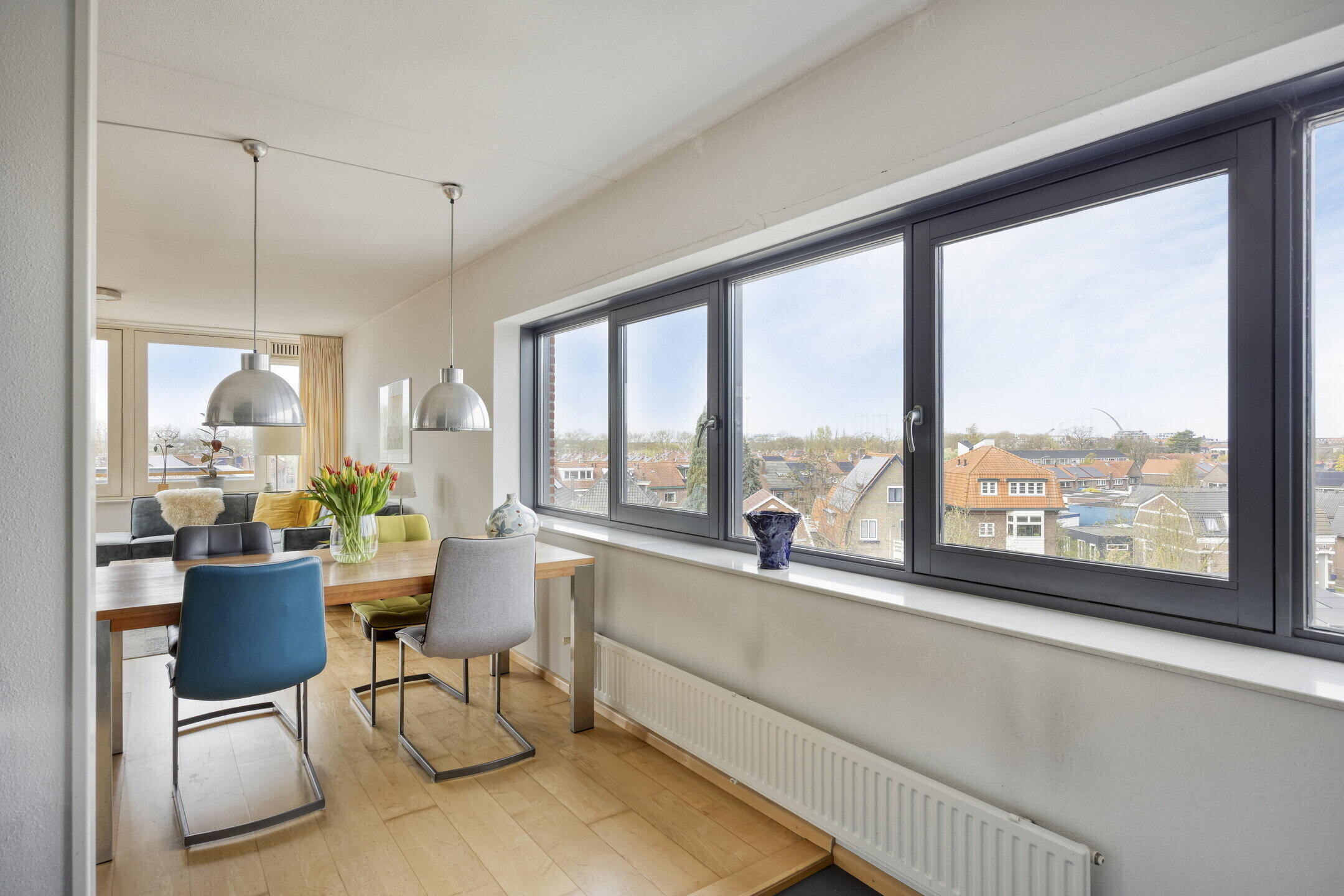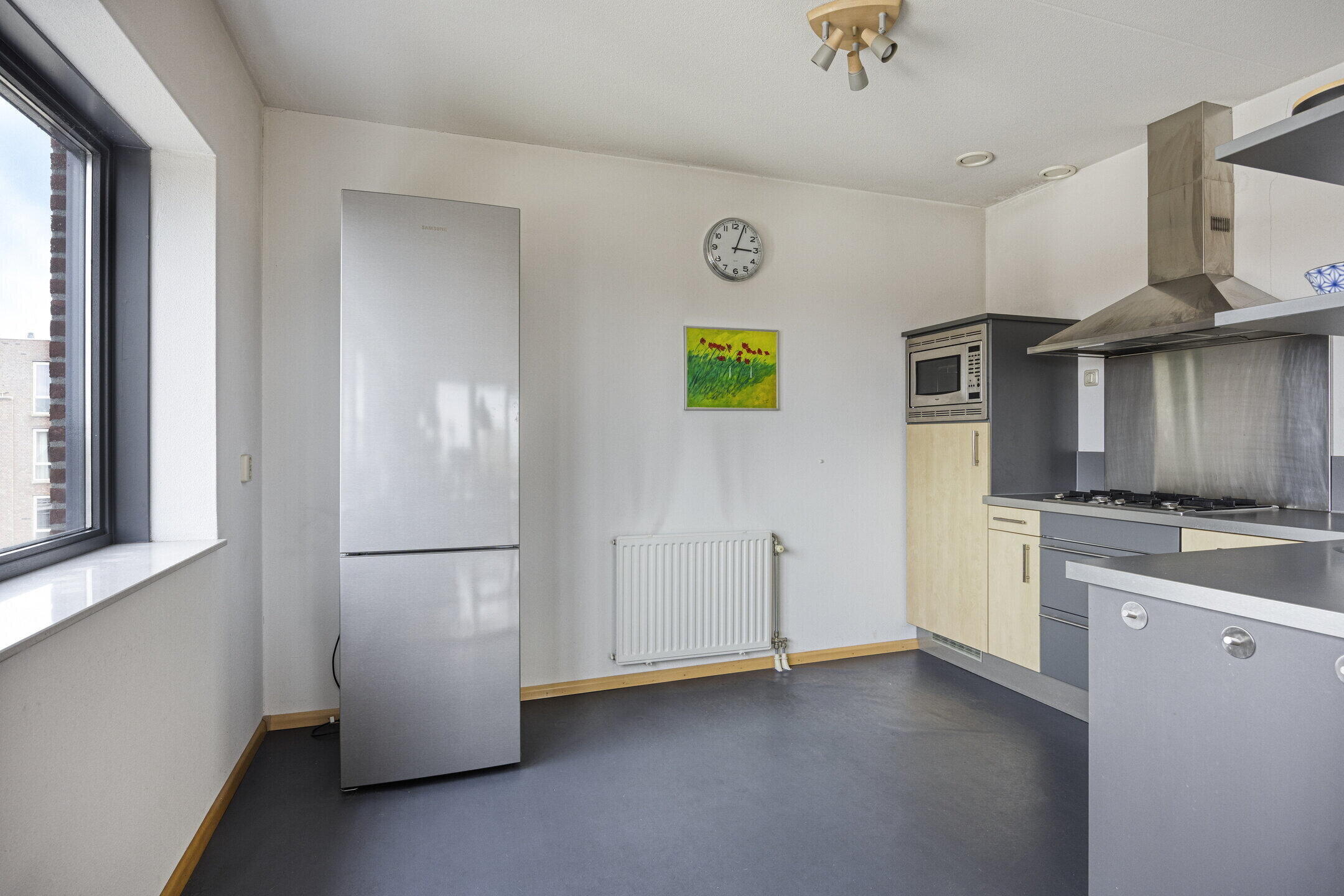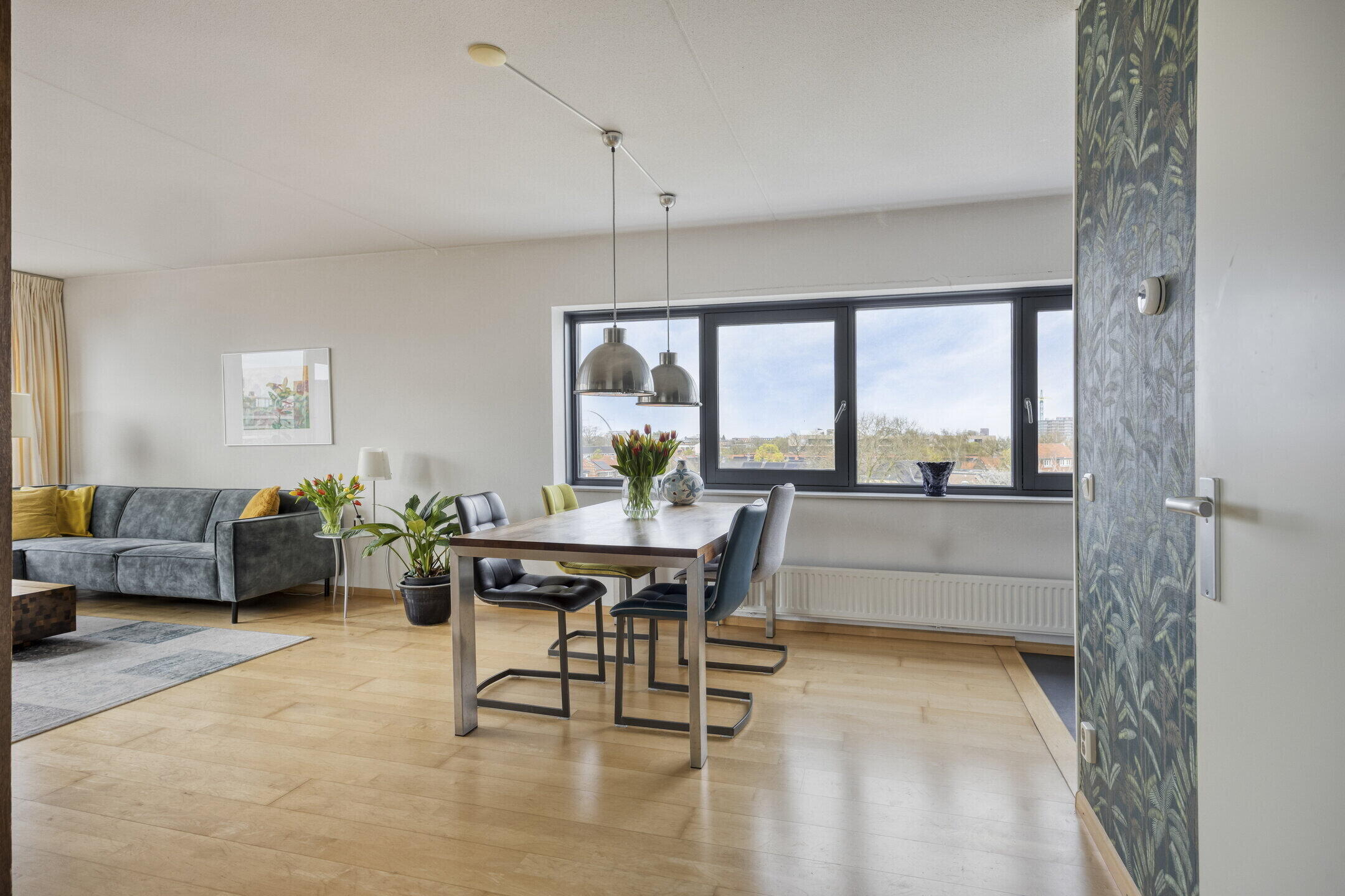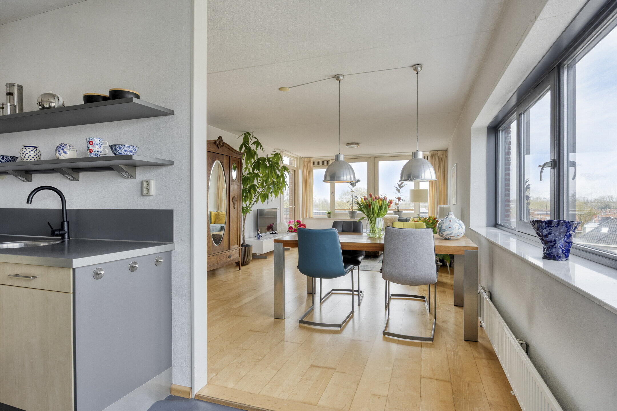 Woonkamer met door de hoekligging en veel extra raampartijen, vrij uitzicht over een groot deel van de stad. Aansluitend het balkon met middag en avondzon; halfopen keuken met hoekinrichting voorzien van ingebouwde 4-pits gaskookplaat, afzuigkap, combioven en vaatwasser.