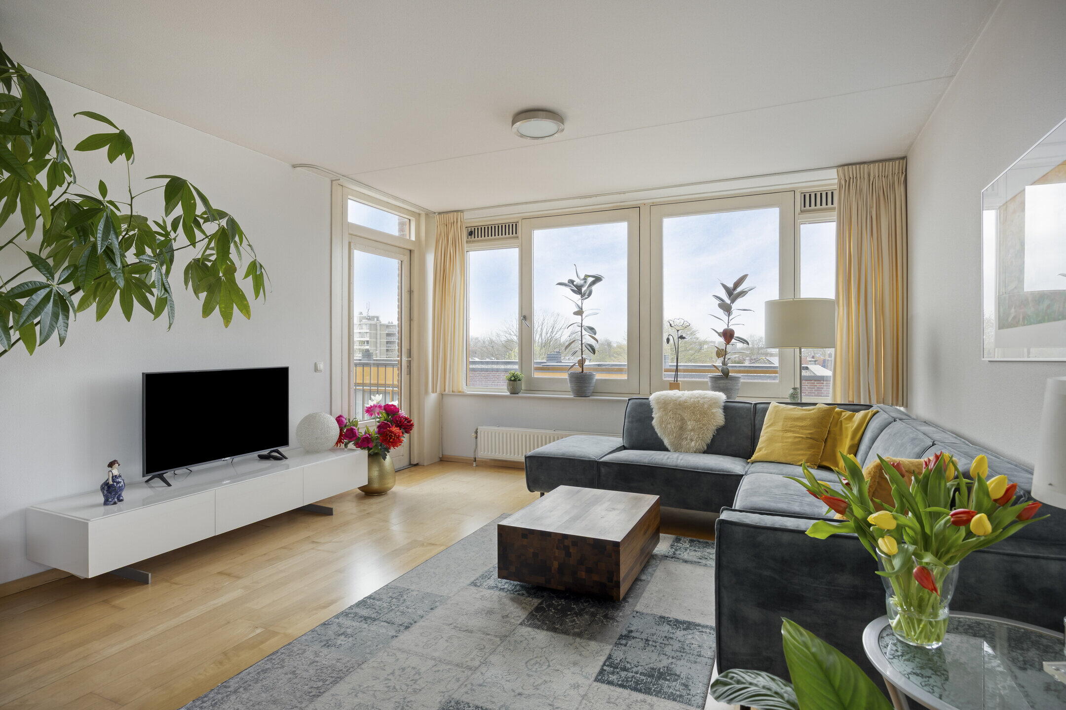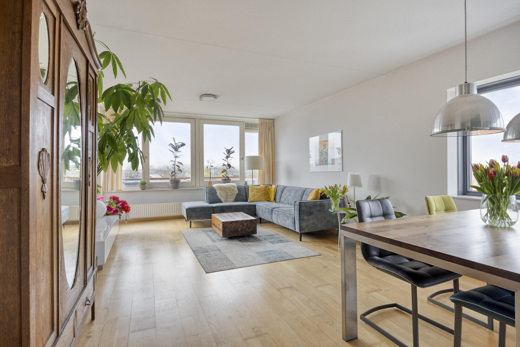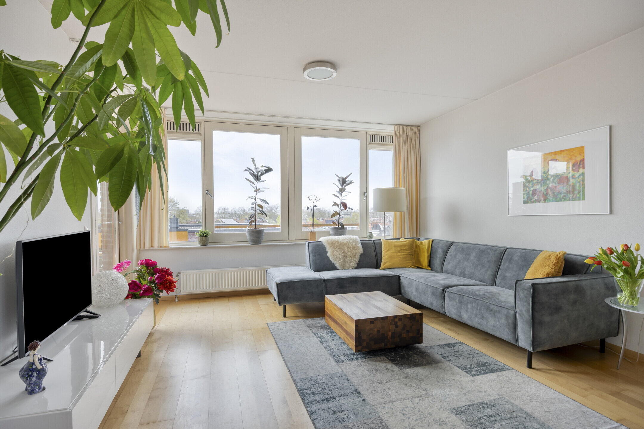 Woonkamer met door de hoekligging en veel extra raampartijen, vrij uitzicht over een groot deel van de stad. Aansluitend het balkon met middag en avondzon; halfopen keuken met hoekinrichting voorzien van ingebouwde 4-pits gaskookplaat, afzuigkap, combioven en vaatwasser.
